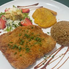 DESCRIPCIÓN Exclusivo filete de Arapaima (aprox. 210 g), empanizado y preparado con delicadeza, ideal para paladares exigentes. Se acompaña con consomé de pescado, arroz blanco o con coco, ensalada césar y patacón. Nivel de espinas: 0/10$ 34.000 -