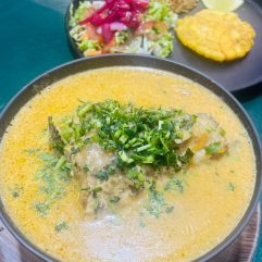DESCRIPCIÓN Moncholo del río (aprox. 500 g), con sabor suave y piel dorada. Acompañado con consomé de pescado, arroz blanco o con coco, ensalada fresca y patacón. Nivel de espinas: 4/10$ 35.000*precio varía según el tamaño.
