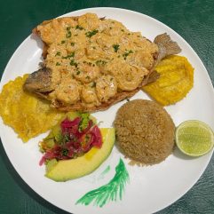 DESCRIPCIÓN Dorada tradicional de rio (aprox. 500 g), de característico sabor intenso y textura firme, frita al punto. Acompañada con consomé de pescado, arroz blanco o con coco, ensalada fresca y patacón. Nivel de espinas: 8/10$ 42.000*precio varía según el tamaño.