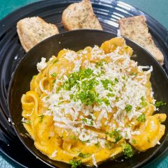 Desde Europa al pacifico colombiano. (Aprox. 180g) de camarones frescos salteados en mantequilla, salsa especial de la casa y servidos en linguini; pasta de origen italiano. Se acompaña con mogolla integral salteada.$ 40.000 -