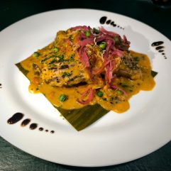 Bagre de río (225 g), cocinado al estilo tradicional en un sudado con vegetales salteados, salsa de vegetales y leche de coco. Sabroso y reconfortante. Servido con arroz blanco o con coco, ensalada fresca y patacón.
