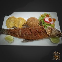 La frescura del mar en versión crocante. (Aprox. 220 g) de langostinos marinados cubiertos en un rebozado que resalta su textura y jugosidad. Acompañados de arroz blanco o con coco, ensalada César y chips de plátano.