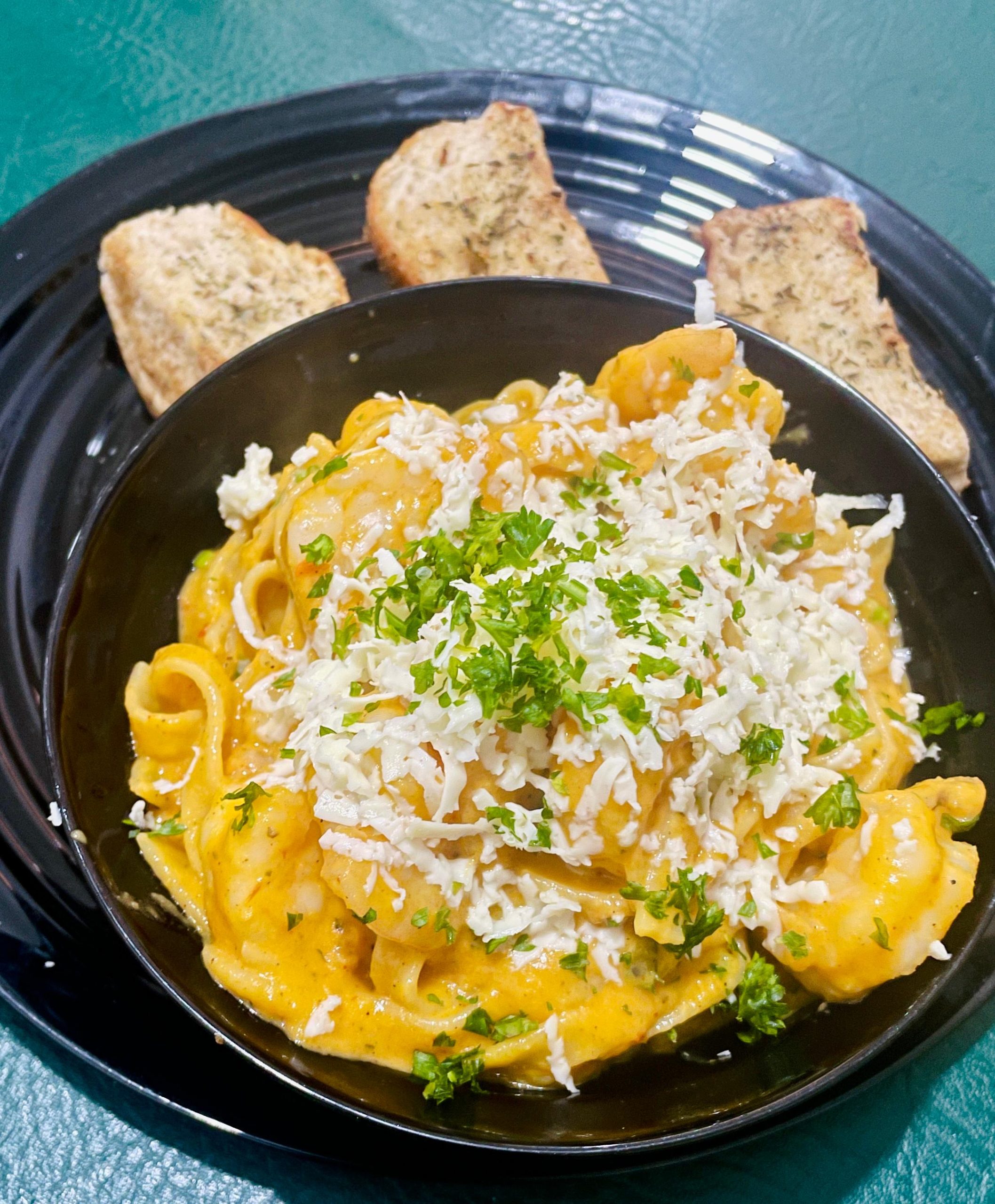Desde Europa al pacifico colombiano. (Aprox. 180g) de camarones frescos salteados en mantequilla, salsa especial de la casa y servidos en linguini; pasta de origen italiano. Se acompaña con mogolla integral salteada.