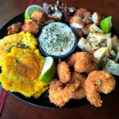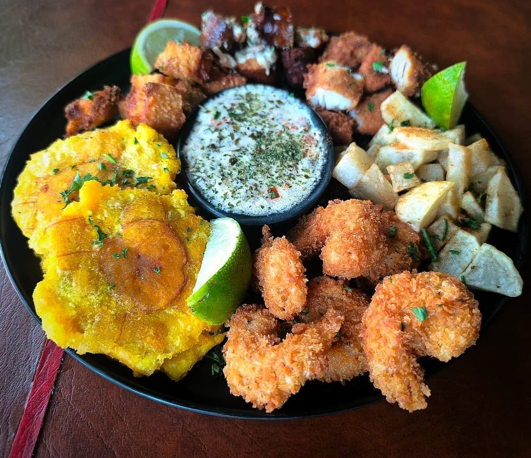 DESCRIPCIÓN Bocados variados para compartir. Chorizo de atún, camarones apanados, filete de tilapia, queso costeño apanado, patacones crujientes, papas fritas y chimichurri de la casa. Un plato alegre y lleno de sabor.