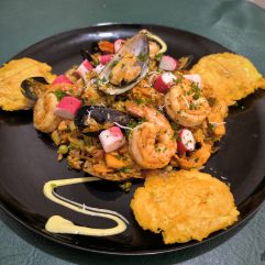 DESCRIPCIÓN Trucha (aprox. 400 g), de carne firme y piel brillante. Se acompaña con consomé de pescado, arroz blanco o con coco, ensalada fresca y patacón. Nivel de espinas: 2/10